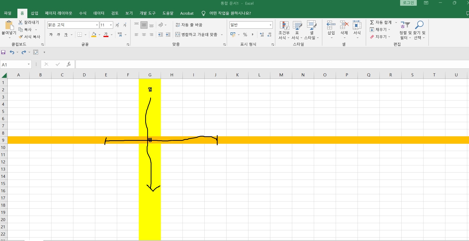 위 이미지 기준으로 엑셀 시트의 노란 부분이 '열'이고, 주황색 부분이 '행'입니다.